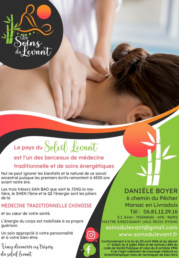 J’ai grandi dans une ferme du bourbonnais proche d’un parc animalier et d’attractions très connu. A l’âge de 8 ans, j’ai souffert une grave brulure au 3ème degré du pied droit qui m’a paralysé pendant plus de 3 mois. C’est à cette occasion que j’ai reçu mon premier soin de magnétisme. J’ai voulu me consacrer à une profession paramédicale, tout en cultivant une attirance pour la Médecine Traditionnelle Chinoise. Je suis diplômée d’un bac d’assistante médico-sociale, profession que j’ai exercée sur la région clermontoise pendant 11 ans. Puis, je suis venue m’installer à Ambert en 1999 en changeant complètement d’activité professionnelle. D’abord cogérante d’une société de plomberie chauffage, j’ai ensuite fait carrière pendant 17 ans dans une société leader française du désenfumage industriel. J’avais plusieurs fonctions : technico-commerciale, responsable de service travaux, gestion d’équipe. Je me suis épanouie dans tout ce parcours professionnel, mais j’en ai oublié l’essentiel. Pour moi, la santé est au cœur de la vie. Platon disait déjà en son temps : « les maux du corps sont les mots de l’âme. Ainsi on ne doit pas chercher à guérir le corps sans chercher à guérir l’âme. » C’est en 2016, que j’ai reçu mon premier soin REIKI et cela m’a profondément touché. J’ai eu la chance de rencontrer René Chatagnon qui m’a initié au REIKI et je suis aujourd’hui SHINPIDEN SHIHAN, c’est-à-dire Maitre REIKI et peux à mon tour transmettre le savoir faire de ce soin. Recherchant toujours le soulagement de mes maux, j’ai aussi travaillé d’autres domaines devenant tour à tour : Praticienne en Hypnose, puis en E.F.T. L’expérience qui a changé mon destin a été une marche sur le feu. Cela parait fou d’oser se lancer pieds nus sur un tapis de braises de 10 mètres de long et ne ressentir à la fin aucune brulure mais juste l’envie de faire ce que l’on choisit, d’avoir la force de changer de vie. Ainsi, j’ai repris mes études et cette fois je me suis tournée vers l’école de Médecine Traditionnelle Chinoise de Clermont Ferrand pour acquérir un art, celui du massage TUINA enseigné par Franck BEAU. J’ai eu la chance de côtoyer ces 2 maitres chacun dans leurs spécialités, enseignant en toute bienveillance. Et voilà, au fil du temps, les « Soins du Levant » ont vu le jour alliant les trois pratiques initiées des mêmes sources. Chacune travaille sur les méridiens et les centres d’énergie. Je vais vous laisser découvrir mon univers dans les pages de ce site, et vous invite à venir me rencontrer. A très bientôt.